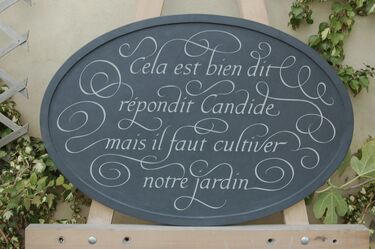 ×Lettering in stone can look stunning in a garden setting. Examples of our work include slate obelisks and garden wall plaques. Hand carved lettering in stone can also be used for sundials, bird baths, benches and water features.